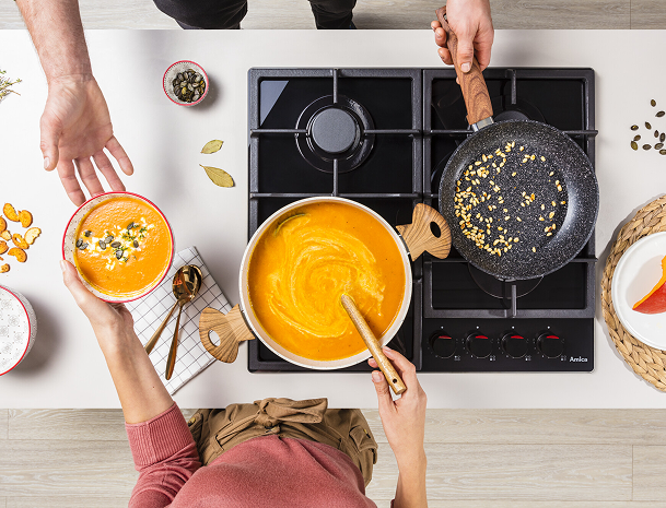 Vaříte víc? Na plynové varné desce Amica máte více místa na větší hrnce! Díky nové konstrukci se zvětšily vzdálenosti mezi hořáky, avšak standardní rozměry desky zůstaly zachovány. Proto můžete nyní používat větší nádoby – a to hned několik najednou. Větší prostor pro větší pohodlí při vaření!